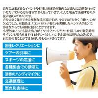 携帯しやすい大きさのハイパワー拡声器近年はさまざまなイベントや行事、地域での案内など盛んに活動を行っていただいている方が非常に多くなっています。そんな場面で活躍するのが拡声器(メガホン)です。声を大きく発声できる便利な拡声器ですが、今までは「大きく」「重い」のが欠点でした。本製品は、「コンパクト」「軽く」を実現したハンドメガホンで、歩きながらでも身軽に使うことができます。小型とはいっても最大出力が5ワットとハイパワー仕様、しかも緊急時用サイレンも鳴らせます(115デシベル)ハンドル部分は折りたたみ式で、肩に掛けることができる肩ヒモもセットされてます。