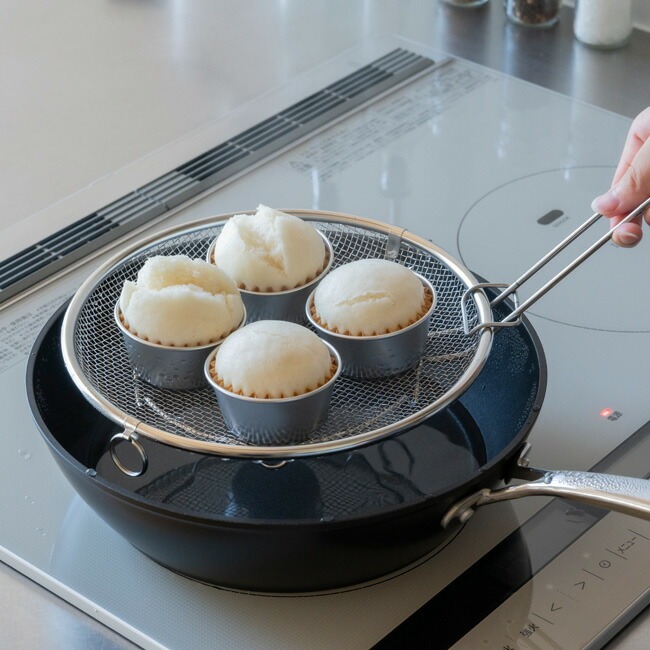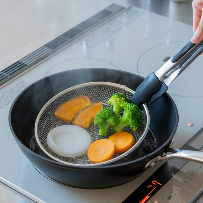 取っ手のない盆ざるはフライパンや鍋に入れやすく、蒸し料理にも最適。「すっきり暮らす盆ざる19cm」は24cmフライパン、「すっきり暮らす盆ざる22cm」は26cmフライパンに入ります。