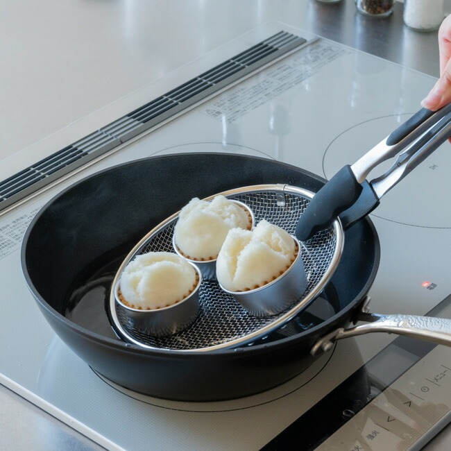 | 取っ手のない盆ざるはフライパンや鍋に入れやすく、蒸し料理にも最適。「すっきり暮らす盆ざる19cm」は24cmフライパン、「すっきり暮らす盆ざる22cm」は26cmフライパンに入ります。※形状によって入らない場合もございます。 |