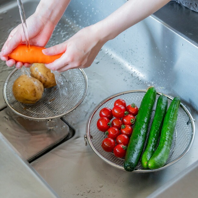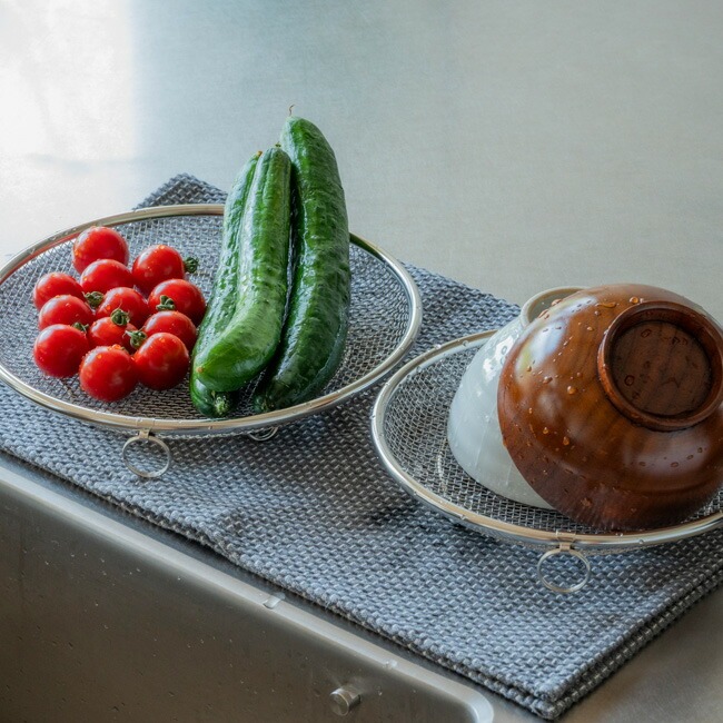 | ボウル型のざると比べ、ほぼ平らで食材が重なりにくく、水切れが早いのが魅力。粗熱取りの時間短縮にも◎ |