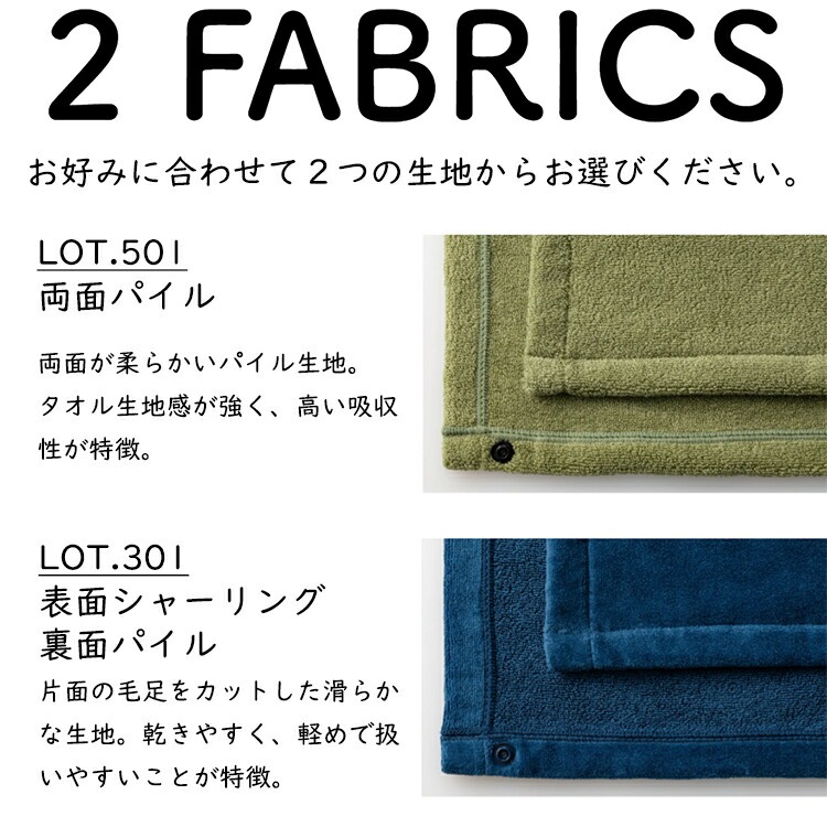 →LOT501 は、両面とも柔らかなパイル生地で、高い防御性が特徴。LOT301 は、片面の毛足をカットしており、少し薄手で軽めです。取り回しがしやすく、乾きやすいのが特徴です。機能性は同等ですので、ご自身のお好みでお選びいただいて問題ありません。