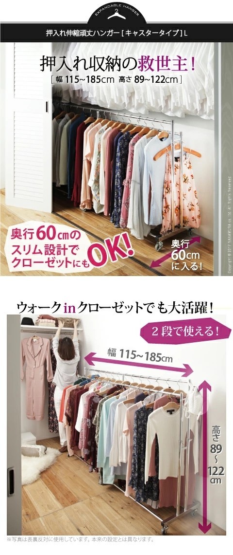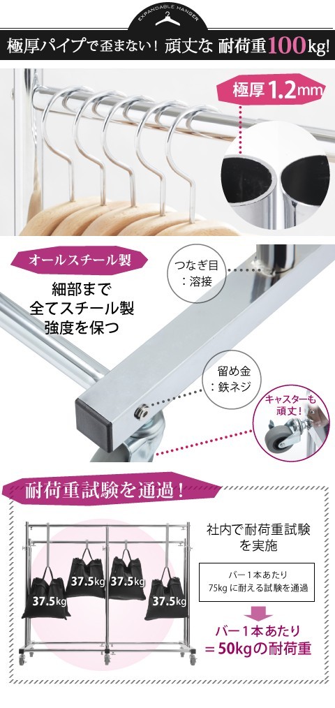 ハンガーラック 押入れ クローゼット 押入れ伸縮頑丈ハンガー-ポルタ キャスタータイプ- L 115cm〜185cm 収納 スチール シンプル 大容量 洋服掛け 頑丈 パイプ