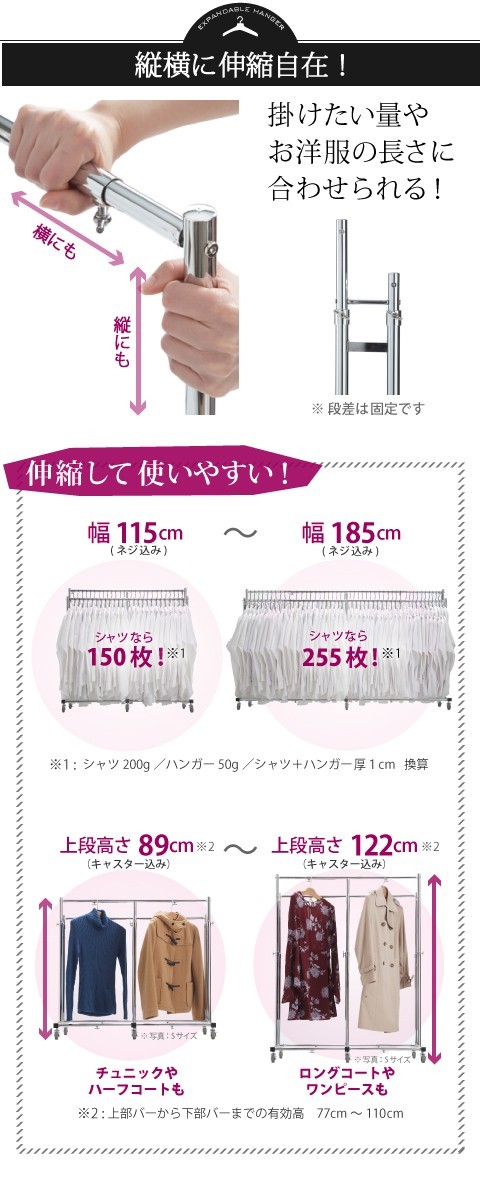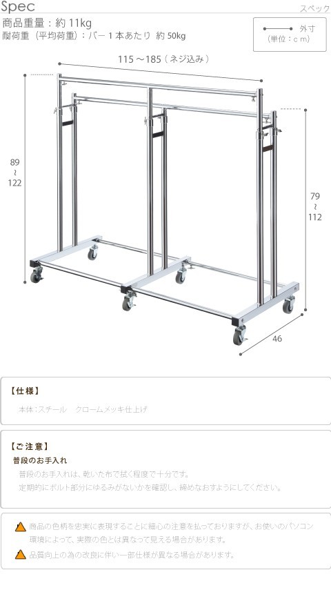 本体伸縮幅(ビス含む):幅115〜185cm本体伸縮高さ(上段/下段):89〜122cm/79〜112cmバー使用幅:107〜177cmバー下からポールまで高さ(上段/下段):77〜110cm/67〜100cm