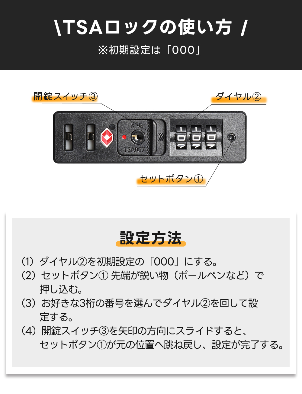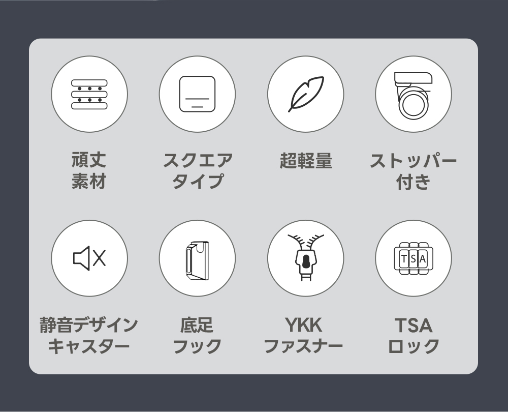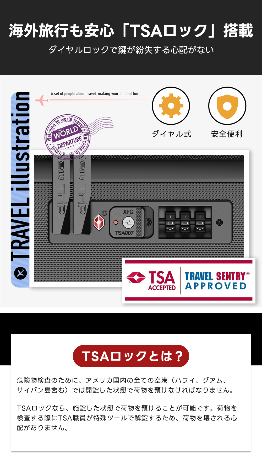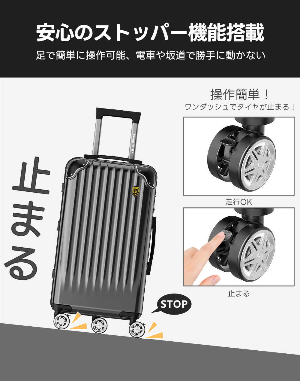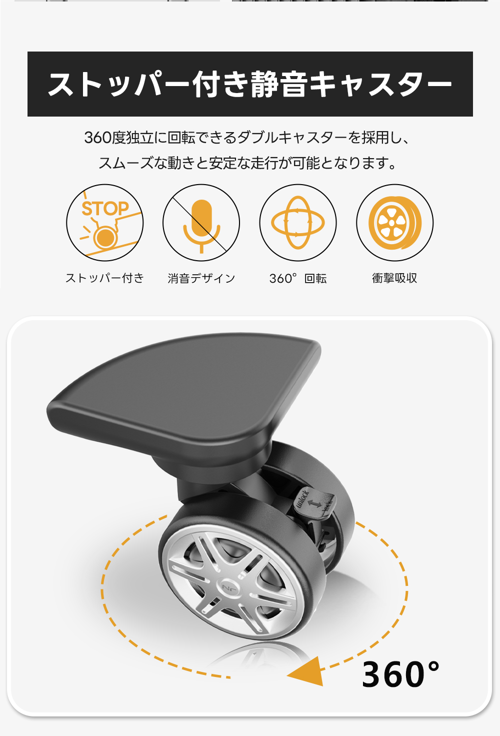 旅行に便利な『TSAロック』、安定走行の『双輪キャスター』も搭載し、ストッパー付もっと快適な旅に