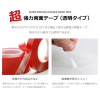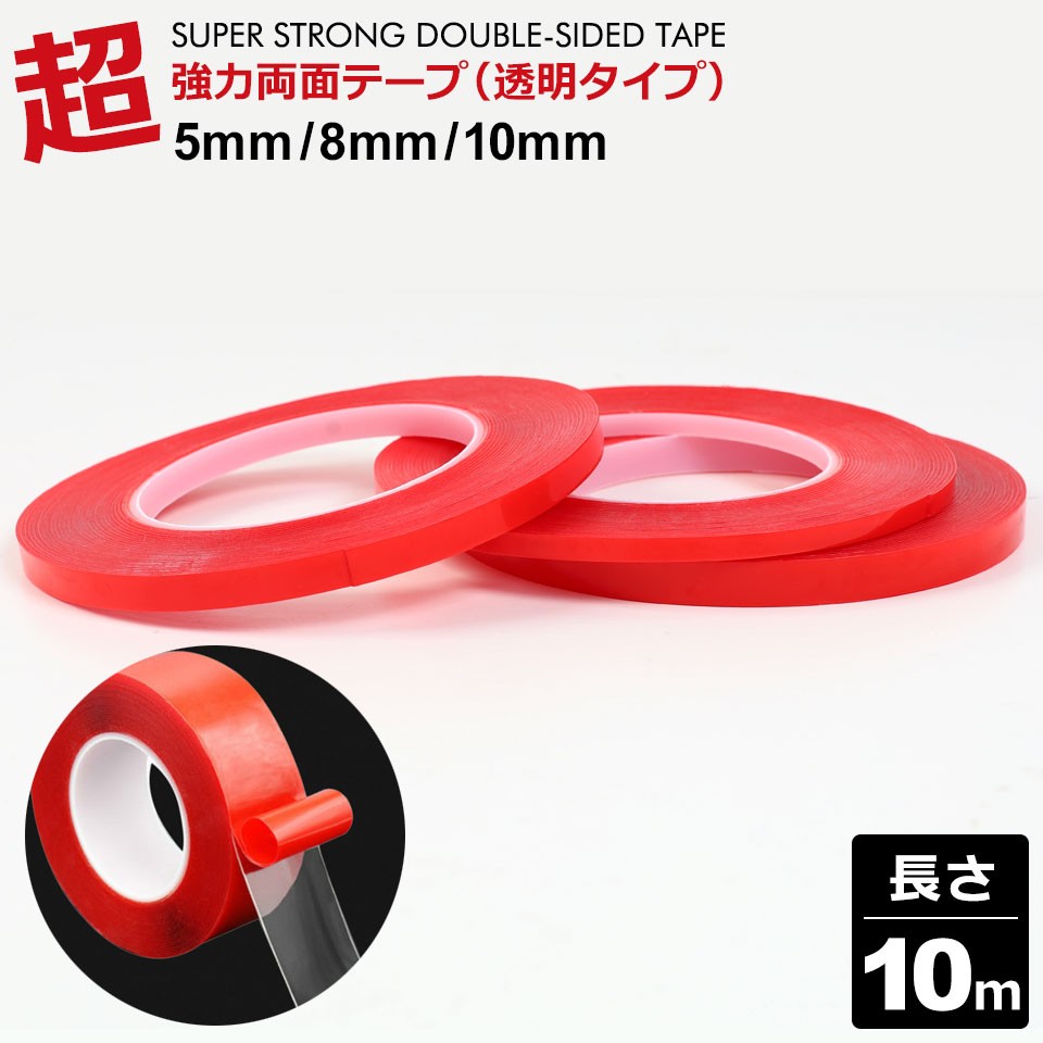 | 商品について | 【超強力両面テープ(透明タイプ)】 車のカスタマイズからDIYまで幅広く使える超強力両面テープ。防水だから屋外でも使用できます。 【透明だから目立たない】 透明で目立ちにくい厚さ1mmのテープ。赤い剥離フィルムが付いていますが、テープ自体は無色透明です。 【粘着跡が残りにくい】 超強力な両面テープですが、剥がしても粘着跡が残りにくいスグレモノです。 【5mm/8mm/10mmの3タイプの幅をご用意しました】 超強力両面テープの幅は、5mm/8mm/10mmの3タイプです。厚さは1mmで、長さは10mです。 |