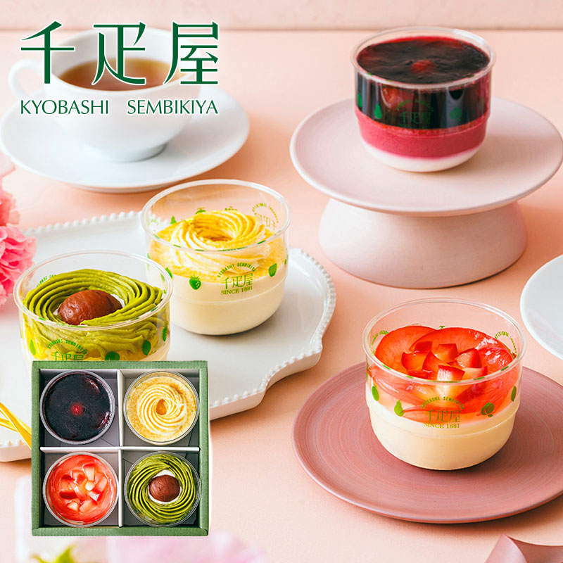 | りんごのレアチーズ 内容量 約112g 抹茶モンブラン 内容量 約107g バナナティラミス 内容量 約88g ぶどうゼリー&2層のムース 内容量 約159g 各1個 計4個入 ※手作りの商品のため、内容量は若干前後することがございます。 |