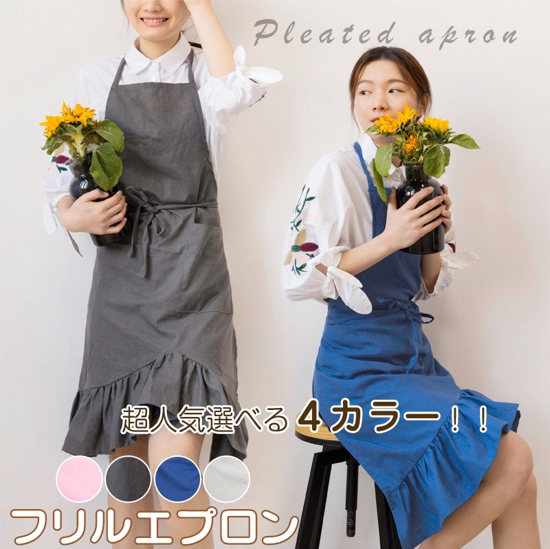 前でヒモを結ぶオシャレかわいいカフェ風スタイル。 後ろで結ばないのでバックスタイルはスマートな 雰囲気にウエストやヒップが引き締まって見えます。