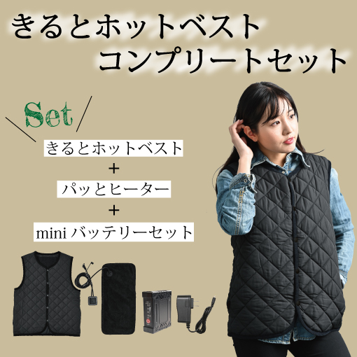 ◆内側の面ファスナーにパッとヒーターをワンタッチ取付け!ヒーターウェアに変わる防寒ベスト!【届いてすぐに使えるようベスト・ヒーター・充電器・バッテーリーをセットにしました。】バッテーリーは何を使うの?充電器は?の心配がなくなりました。◆インナーベストに・アウターとしても●サイズ:L●肩幅(cm):42●身幅(cm):55●身丈(cm)●身丈(cm):67●カラー:ブラック●本体重量(g)●本体重量(g):353●素材:表地・中綿・裏地:ポリエステル100%/パイピング部:綿100%/別地:ナイロン100%●セット内容::きるとホットベスト・パッとヒーター・miniバッテーリーセット