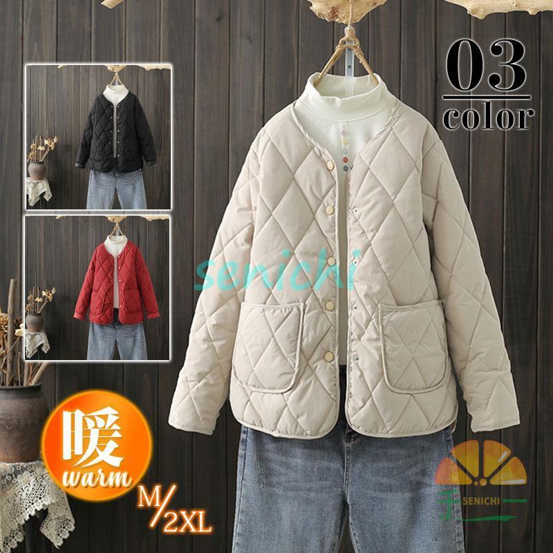 キルティングコート レディース 中綿コート 襟なし ショート丈 長袖 キルティング 無地 軽量 大きいサイズ 暖かい アウター かわいい ゆったり