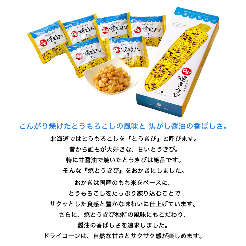 「おいしい焼とうきび、そのものの味」。そんな『焼とうきび』をおかきにしました。 お土産・プレゼント・おやつ・おつまみ・パーティなどにも最適。