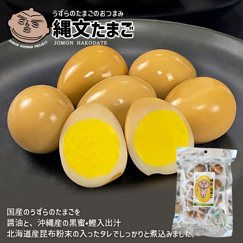 国産のうずらのたまごを、醤油と沖縄産の黒蜜・鰹入ダシ・北海道産の昆布粉末の入ったタレでしっかりと煮込みました。