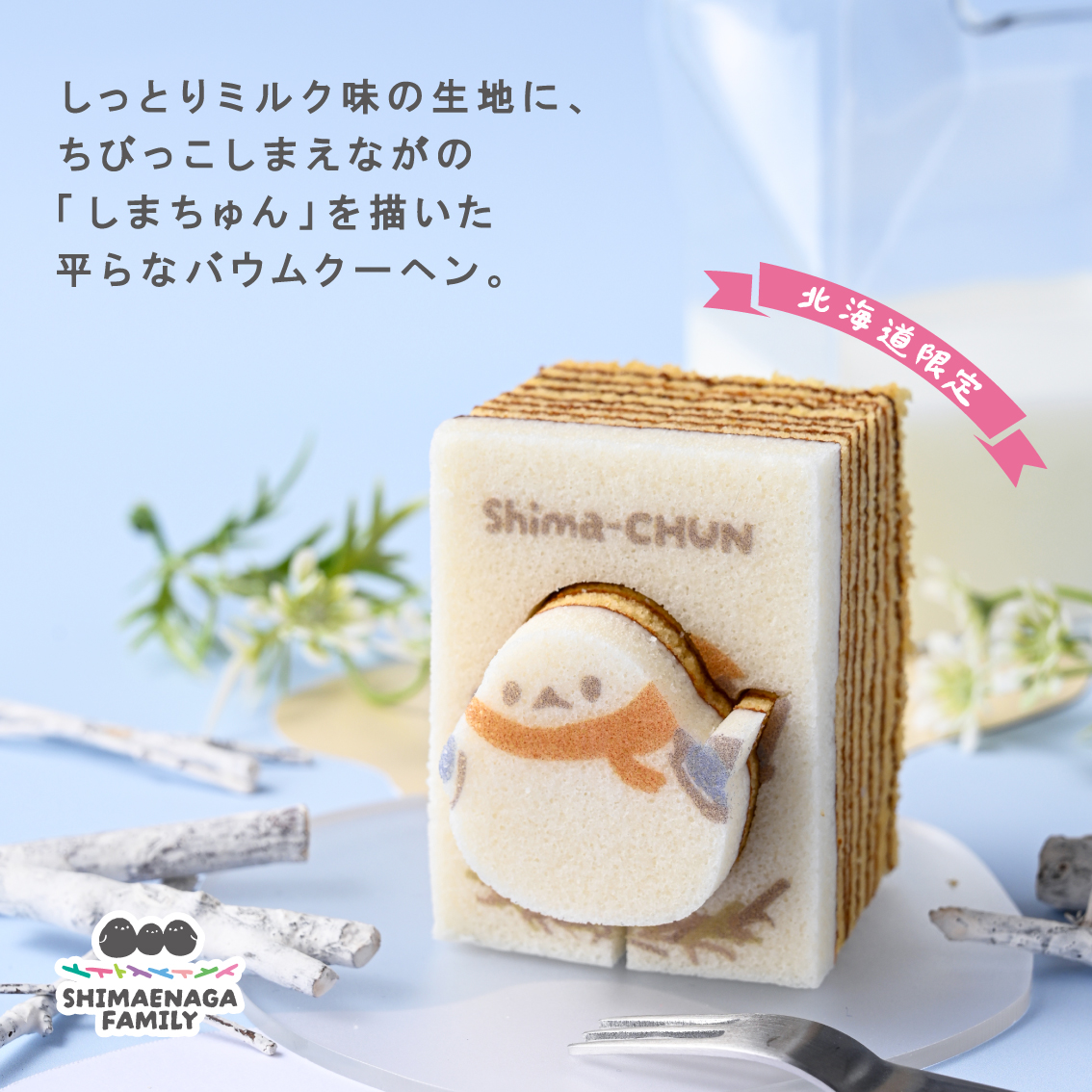 みんな寒がり、だけど冬が大好きなんだって。さわやかいちごミルク味の生地に、やさしいママの「しまえママ」を描いた平らなバウムクーヘン。切れ目にそって型ぬきしながらお召し上がりください。