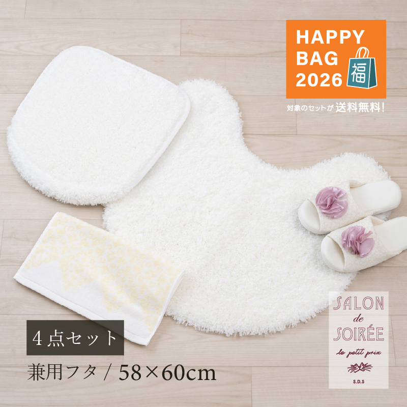 ●商品名:福袋2026 トイレマットセット 4点 約58×60cm トイレマット+兼用フタカバー+スリッパ+タオル SDS シュクルメランジェ アイボリー センコー