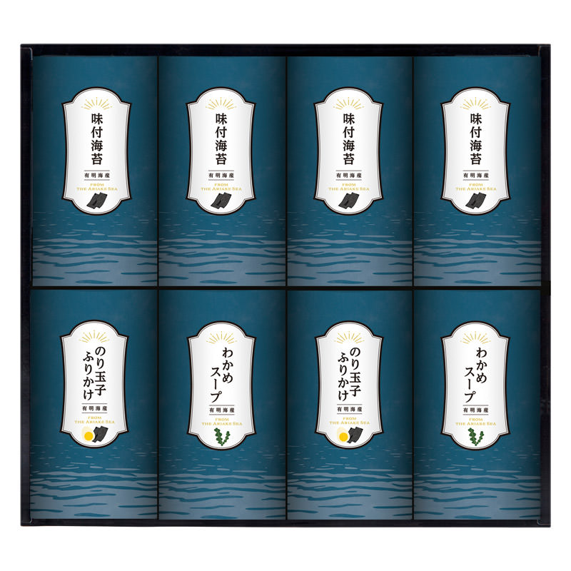 ●セット内容:セット内容/有明海産味付海苔(8切5枚×3袋)×4、のり玉子ふりかけ(4.5g×4袋)・わかめスープ(5.3g×4袋)×各2