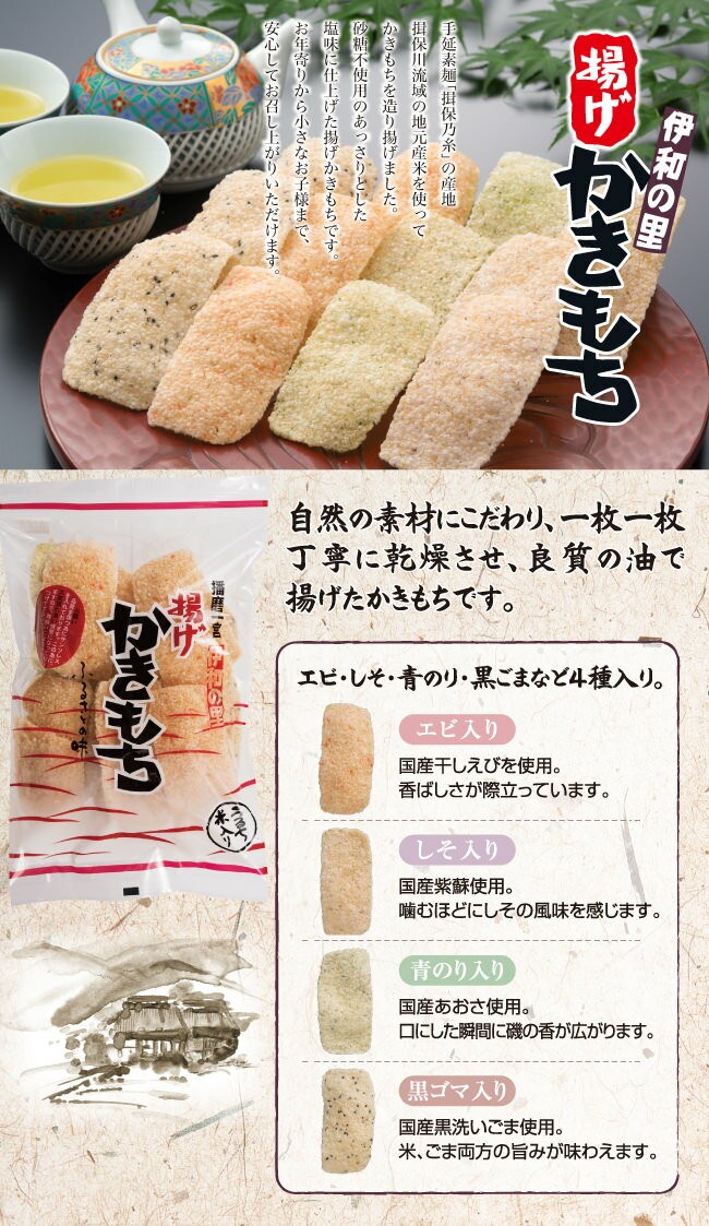 | 商品案内 | 手延素麺「揖保乃糸」の産地揖保川流域の地元産米を使ってかきもちを造り揚げました。 砂糖不使用のあっさりとした塩味に仕上げた揚げかきもちです。 お年寄りから小さなお子様まで、安心してお召し上がりいただけます。 |