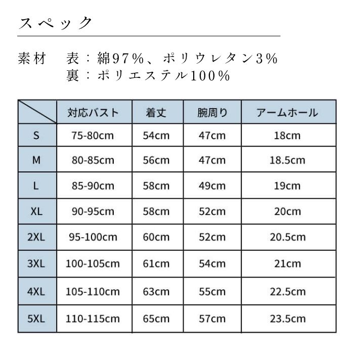 | サイズ | S:対応バスト75-80cm 着丈54cm 腕周り47cm アームホール18cm M:対応バスト80-85cm 着丈56cm 腕周り47cm アームホール18.5cm L:対応バスト85-90cm 着丈58cm 腕周り49cm アームホール19cm XL:対応バスト90-95cm 着丈58cm 腕周り52cm アームホール20cm 2XL:対応バスト95-100cm 着丈60cm 腕周り52cm アームホール20.5cm 3XL:対応バスト100-105cm 着丈61cm 腕周り54cm アームホール21cm 4XL:対応バスト105-110cm 着丈63cm 腕周り55cm アームホール22.5cm 5XL:対応バスト110-115cm 着丈65cm 腕周り57cm アームホール23.5cm | |||||