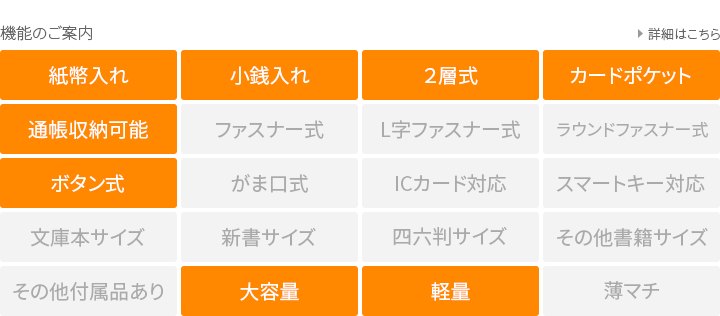 | 小銭入れ | 1ヶ所(L字ファスナー式) |