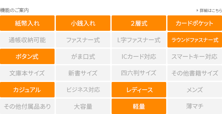 | 小銭入れ | 1ヶ所(ラウンドファスナー式) |