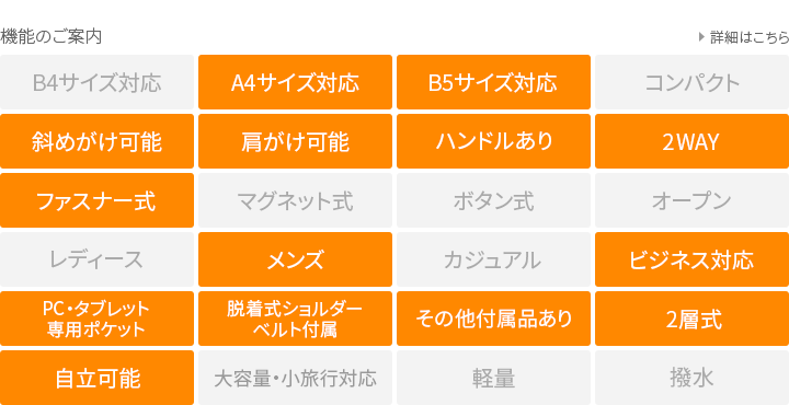 | 内ポケット | オープン×2、ボタン×1、ファスナー×2、ペン挿し×2 |