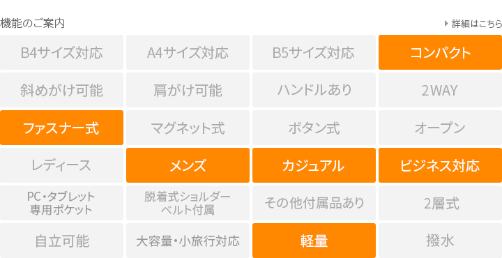 | 内ポケット | オープン×2ヶ所、ファスナー×1ヶ所、ペン挿し×2ヶ所 |