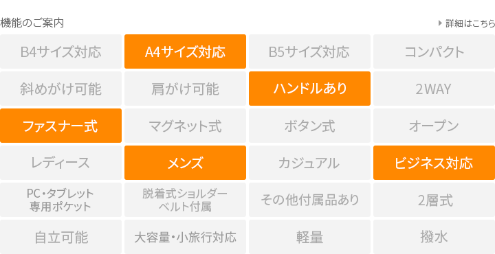 | 内ポケット | ファスナー×1、オープン×2、テープ×1、ペン挿し×3 |