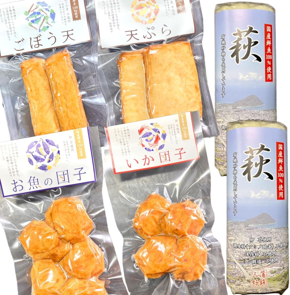 ●セット内容:焼き抜き蒲鉾「萩」85g×2本|いか団子(山口県産ケンサキイカ使用)(4個入)×1袋|お魚の団子(4個入)×1袋|ごぼう天(2本入)×1袋|天ぷら(2枚入)×1袋