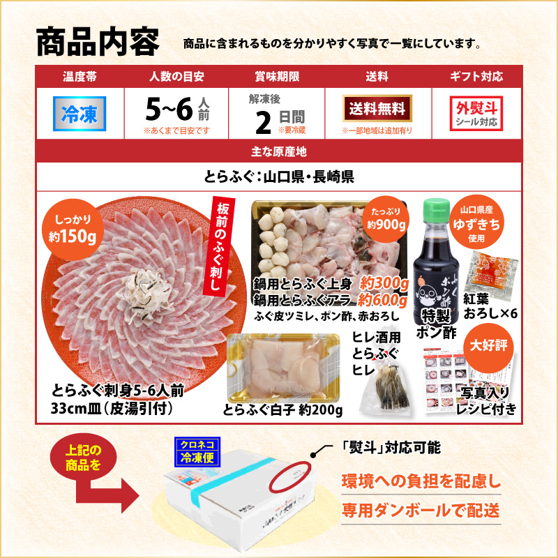 内容量:とらふぐ刺身 約150g、鍋用上身 約300g、鍋用アラ 約600g、とらふぐ白子約200g、ふぐ皮湯引き 約80g、ツミレ 12個、フグヒレ 5〜6枚、ポン酢、薬味