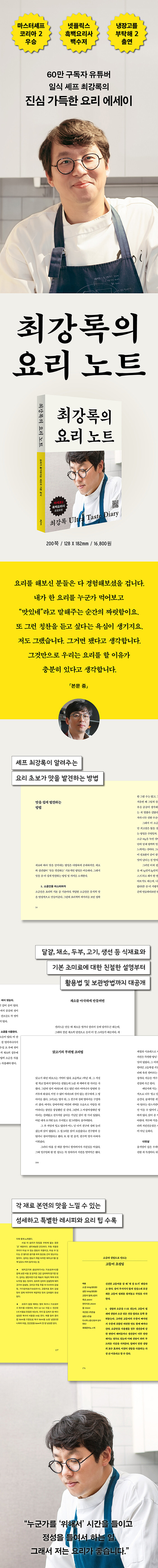 <マスターシェフコリア2>優勝者であり、現在料理YouTubeで活動しているシェフ最強緑の料理エッセイ。単純なレシピやグルメ紹介ではなく、主に「材料と味」の説明を盛り込んでいる。卵は何分煮るべきか、野菜をサクッとする方法や肉を美味しく焼く方法が別にあるのか、刺身をしっかり楽しむ方法は何かなど、材料の持つ味をしっかりと引き出すことができるように、フレンドリーな説明で読者を案内する。