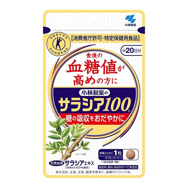 サラシアエキス(1粒あたり100mg配合) 原材料名 サラシアキネンシスエキス/結晶セルロース、糊料(CMC-Ca)、微粒酸化ケイ素、ステアリン酸マグネシウム