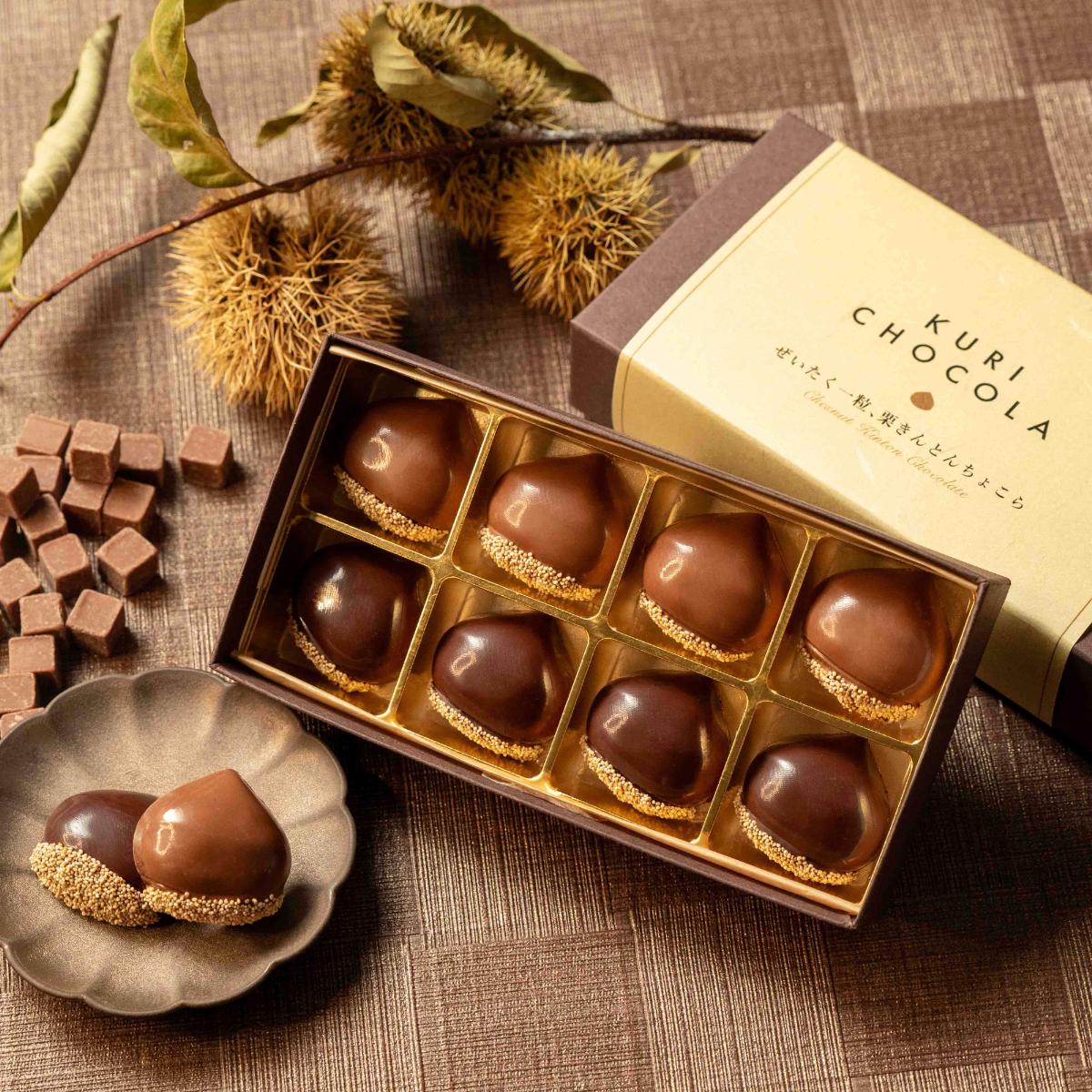栗きんとん×チョコレート 【ぜいたく一粒 栗きんとんちょこら】職人が厳選したミルクチョコレート、スイートチョコレートの中にとろっとした食感に仕上げた栗きんとんと、チョコレートガナッシュを閉じ込めた、栗の香りが贅沢に香る一粒です。栗の甘さを引き立てるミルクチョコレートとジャスミンのような芳しい花の香りを感じる、ほろ苦いスイートチョコレートを使用しています。 けしの実の香ばしさとプチプチとした食感もお楽しみいただけます。※こちらは冷蔵商品です。栗きんとんちょこらのみのご注文は冷蔵配送、冷凍商品と同時注文の場合は冷凍配送となります。●原材料名 【ミルク】砂糖(国内製造)、栗、ココアバター、生クリーム、甘藷でん粉、馬鈴薯でん粉、バター、脱脂粉乳、カカオマス、乾燥クリーム、けしの実、トレハロース、乳化剤、香料(一部に乳成分、大豆を含む)【スイート】カカオマス(国内製造)、栗、砂糖、ココアバター、生クリーム、甘藷でん粉、馬鈴薯でん粉、バター、けしの実、香料、レシチン(一部に乳成分、大豆を含む)■内容量 8個■箱のサイズ 約16.5cm×約8.5cm×約4cm■賞味期限:発送から約14日間・保存方法:冷蔵15℃以下(直射日光・高温多湿を避け、涼しい場所で保存して下さい)