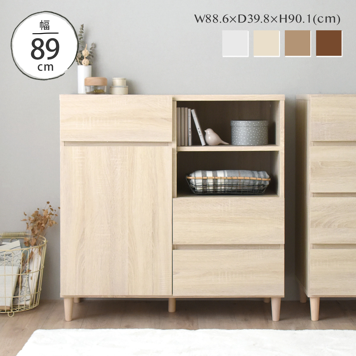幅約89cm、大容量キャビネット。北欧テイストで木目のあるホワイトやヴィンテージ加工のオークホワイトカラーなど、豊富なカラー展開。取っ手のついていない、シンプルデザインがおしゃれ。引き出し、扉、オープン部とたくさんの収納スペースでお部屋もすっきり。北欧テイストやホワイトインテリア、韓国インテリアが好きな方におすすめ。