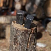 斧が薪に挟まって抜けなくなった時、無理に外そうとすると斧を痛めてしまいます。こんな時はファイヤーサイドのねじりクサビを反対側から打ち込んでやると、回転しながら薪の割れ目をこじ開け、簡単に斧を外すことができます。