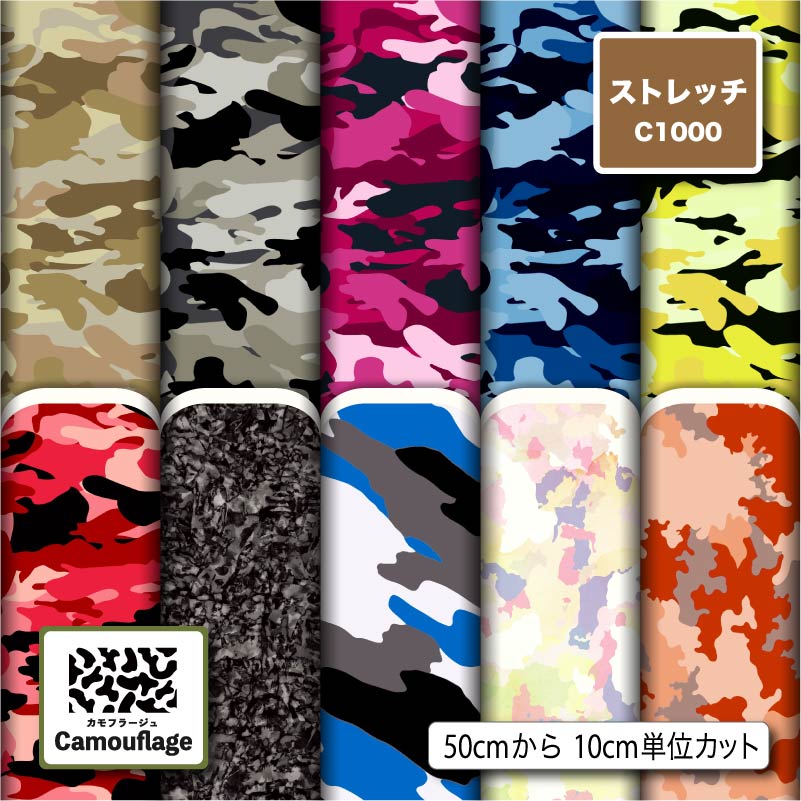 当ページでは【総柄プリント生地 ストレッチニット生地 C1000】に【迷彩柄】が選べます。