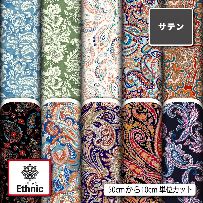 当ページでは【総柄プリント生地 ポリエステルサテン生地】に【エスニック柄】が選べます。