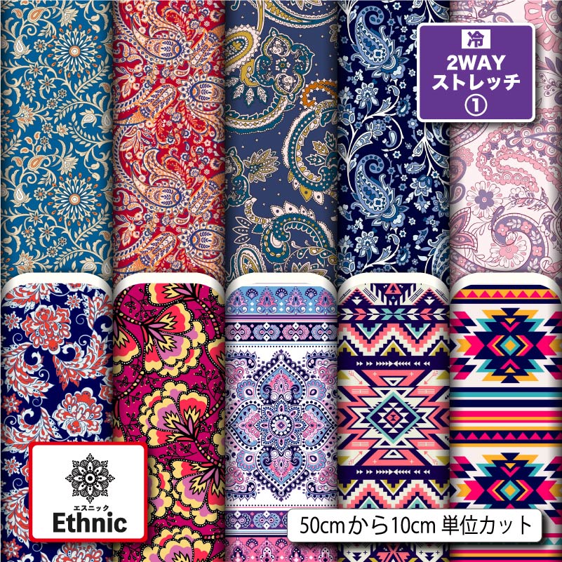生地 布 2wayストレッチニット生地 エスニック柄 プリント生地 10柄 10cm単位 縦横に伸びる 吸水速乾 UVカット 商用利用可 50cmから ハンドメイド 手作り 手芸 マスク 水着 レオタード スポーツウエア レギンス 枕に最適な生地