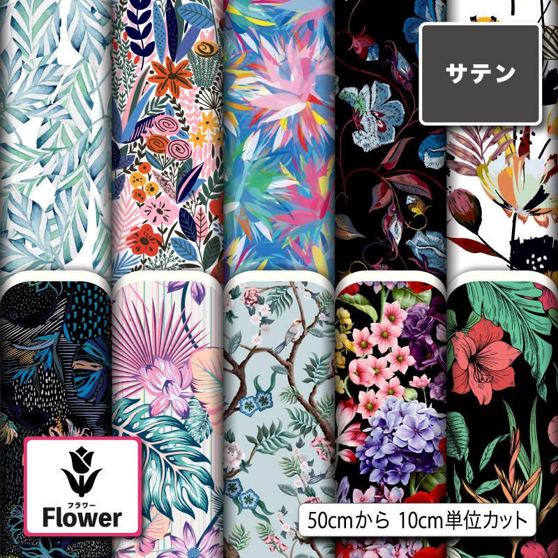 生地 布 花柄 サテン生地 花柄 プリント生地 10柄 10cm単位 光沢 高級感 商用利用可 50cmから ハンドメイド 手作り 手芸 ドレス パーティバッグ ネクタイ ハロウィン コスプレ 体育祭 文化祭 舞台 発表会の衣装 ぬいぐるみ ドール 洋服に最適