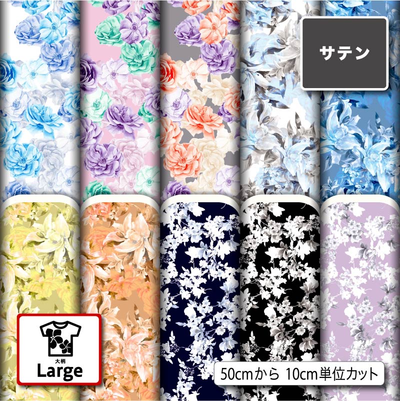 生地 布 大柄 サテン生地 大柄 プリント生地 10柄 10cm単位 光沢 高級感 商用利用可 50cmから ハンドメイド 手作り 手芸 ドレス パーティバッグ ネクタイ ハロウィン コスプレ 体育祭 文化祭 舞台 発表会の衣装 ぬいぐるみ ドール 洋服に最適
