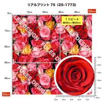 リアルプリント75:ピンク、赤、黄色のバラが鮮やかに描かれた総柄デザイン。