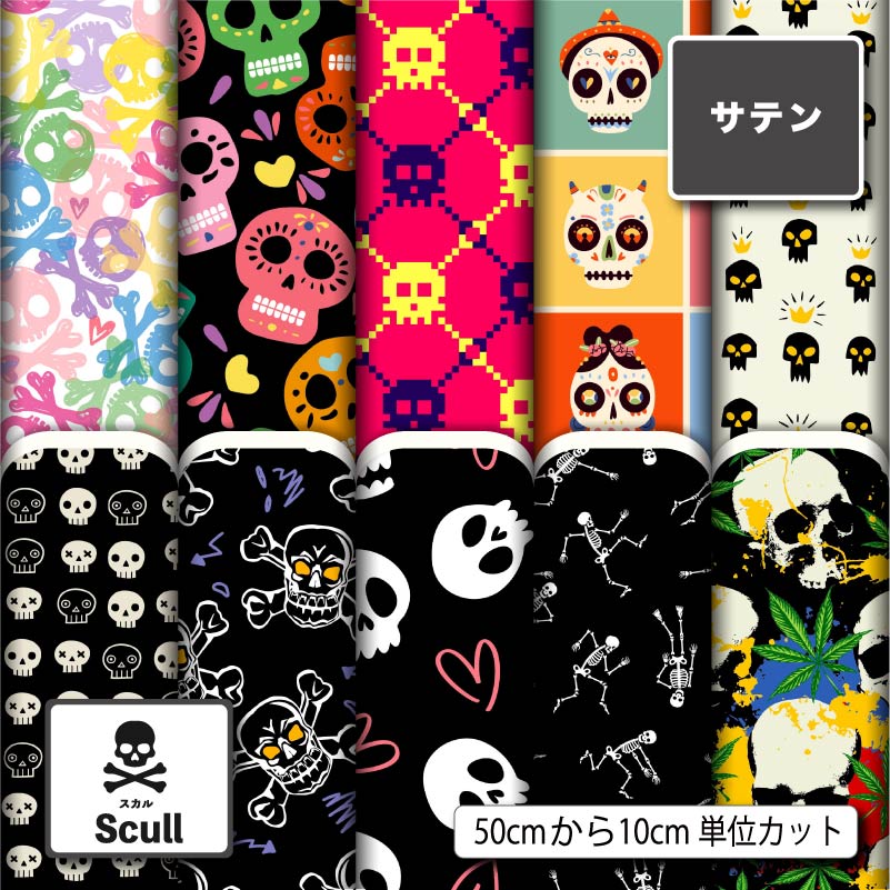 生地 布 サテン生地 ドクロ スカル柄 プリント生地 10柄 10cm単位 光沢 高級感 商用利用可 50cmから ハンドメイド 手作り 手芸 パーティバッグ ネクタイ ハロウィン コスプレ 体育祭 文化祭 舞台 発表会の衣装 ぬいぐるみ ドール 洋服に最適
