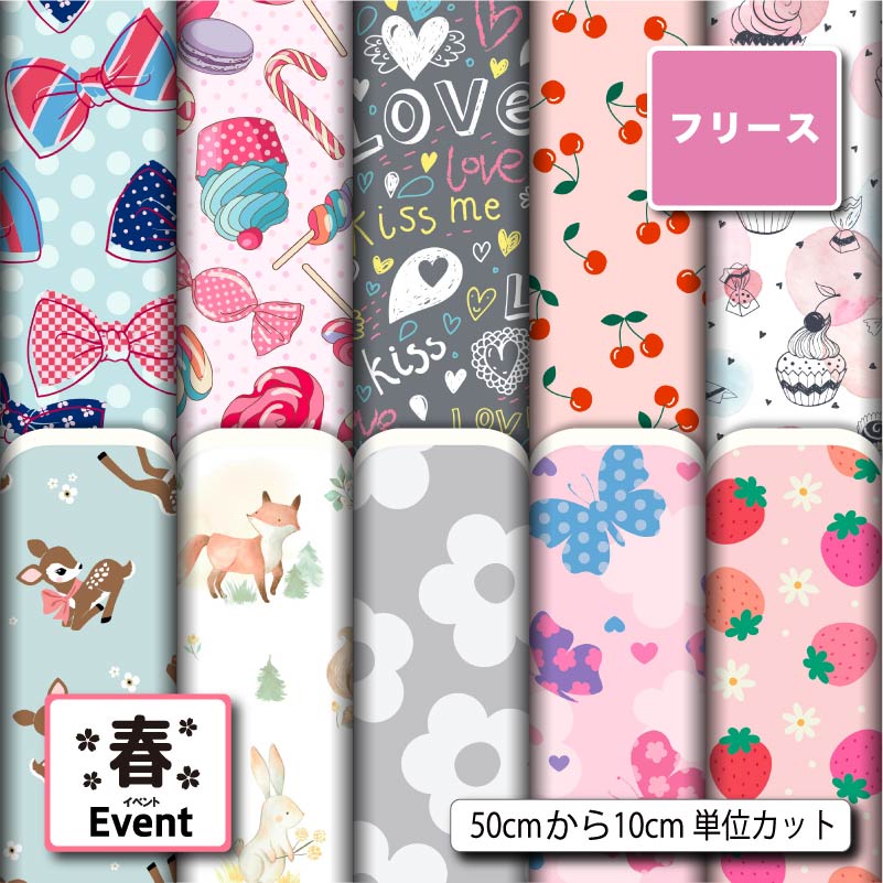 生地 入園 入学 新学期 女の子 子供 春 可愛い かわいい 春の動物 蝶 お菓子 スィーツ 柄 模様 総柄 プリント生地 生地 布 フリース 柄 プリント 秋冬生地 アンチピーリング