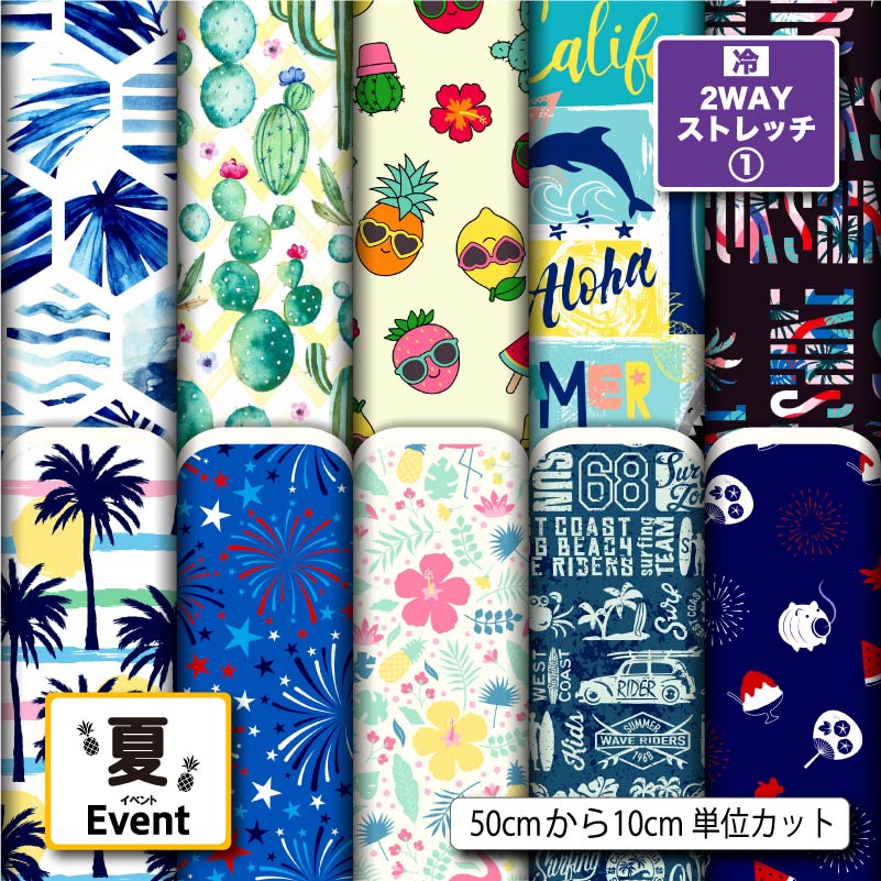 2wayストレッチニット生地 布 夏柄 プリント生地 10柄 10cm単位 縦横に伸びる 吸水速乾 UVカット 商用利用可 50cmから ハンドメイド 手作り 手芸 マスク 水着 レオタード スポーツウエア レギンス 枕 クッションカバーに最適な生地