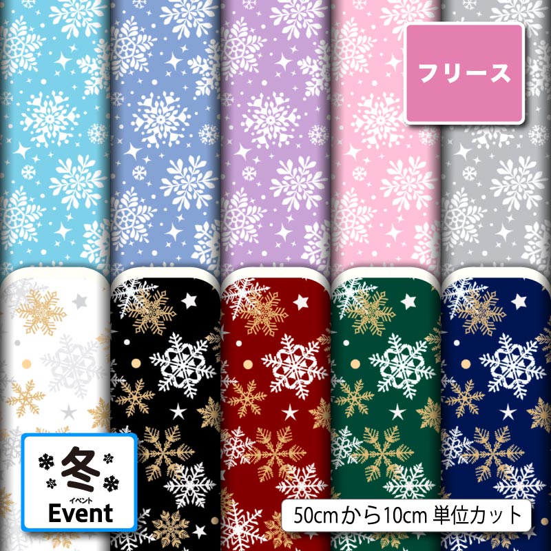 イベント冬101:パステルブルーの生地に雪の結晶を散りばめた、華やかでおしゃれな冬柄の総柄プリント生地。
