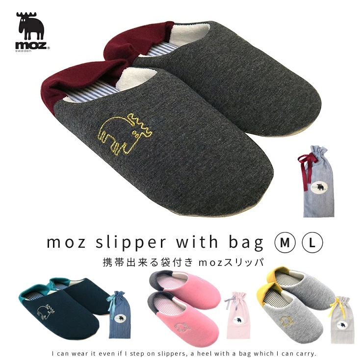 ちょっとおどけた表情がかわいいMozの袋付きスリッパです。