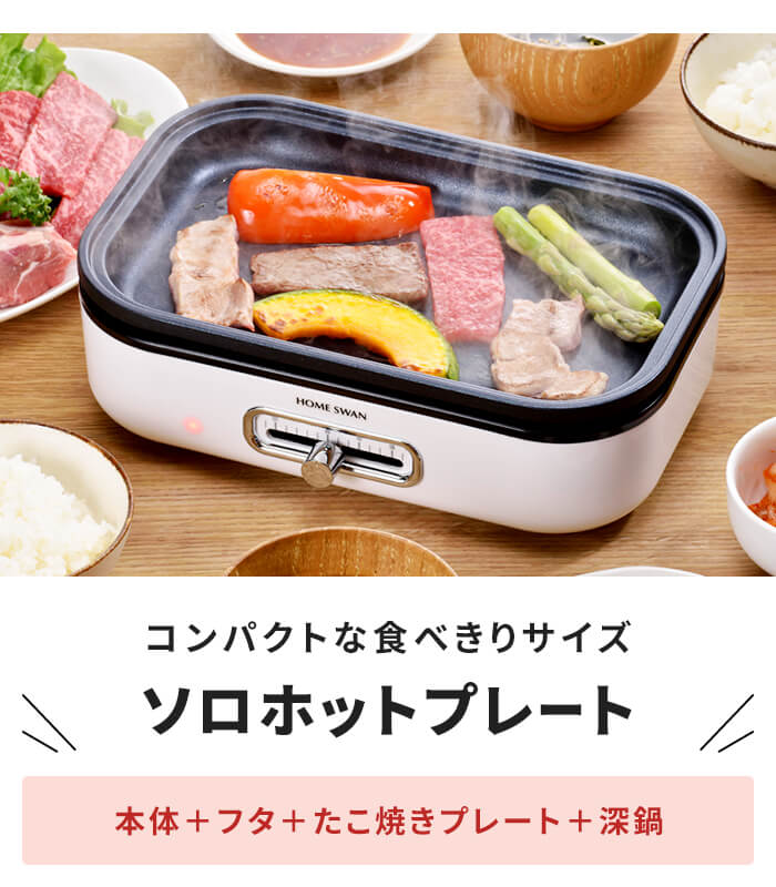 | 平プレートとたこ焼きプレート、深鍋が付属した1〜2人用にちょうどいい小さなホットプレート。 たこ焼きや鍋料理など幅広い料理が楽しめ、温度調節付きで調理から保温まで可能。 およそA4サイズで場所を取らずに調理できるので、調理しながら熱々を食べられます。 フッ素樹脂加工でお手入れ簡単。 プレートは着脱式で丸洗いOK。 |