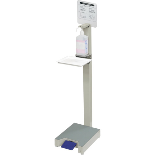 特長 | ●ペダル式で衛生的に消毒が可能です。 ●キャスター付きで移動が簡単です。 ●置台が可動式になっており、市販のディスペンサー(高さ139〜294mm)を取り付け可能です。 ●受け座のサイズはW120×D120mmまでです。 |