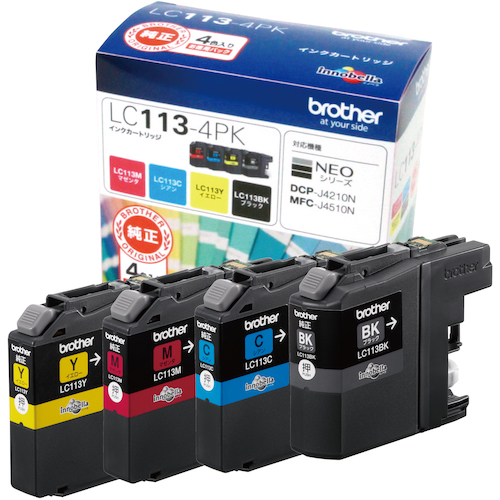特長 | ●インクジェット複合機「PRIVIO」用のインクカートリッジ LC113の4色パックです。 ●LC113BK(ブラック)、LC113C(シアン)、LC113M(マゼンタ)、LC113Y(イエロー)4色各1本がセットになった4色パックです。 |