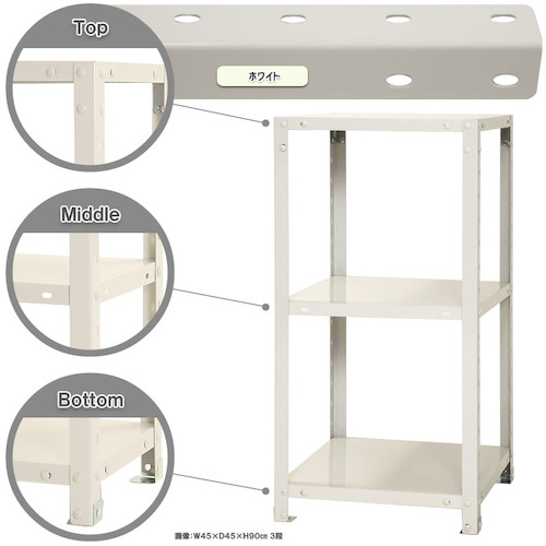 仕様 | ●間口(mm):450 ●奥行(mm):300 ●高さ(mm):900 ●有効間口(mm):390 ●色:ホワイト ●棚段数(段):3 ●均等積載量(kg/段):40 ●棚板調整ピッチ(mm):50 |