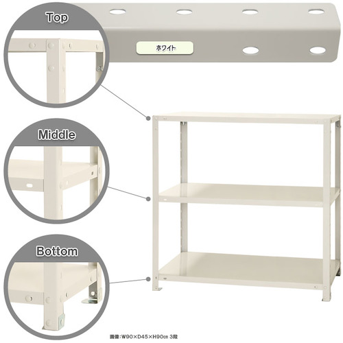 仕様 | ●間口(mm):900 ●奥行(mm):450 ●高さ(mm):900 ●有効間口(mm):840 ●色:ホワイト ●棚段数(段):3 ●均等積載量(kg/段):40 ●棚板調整ピッチ(mm):50 |