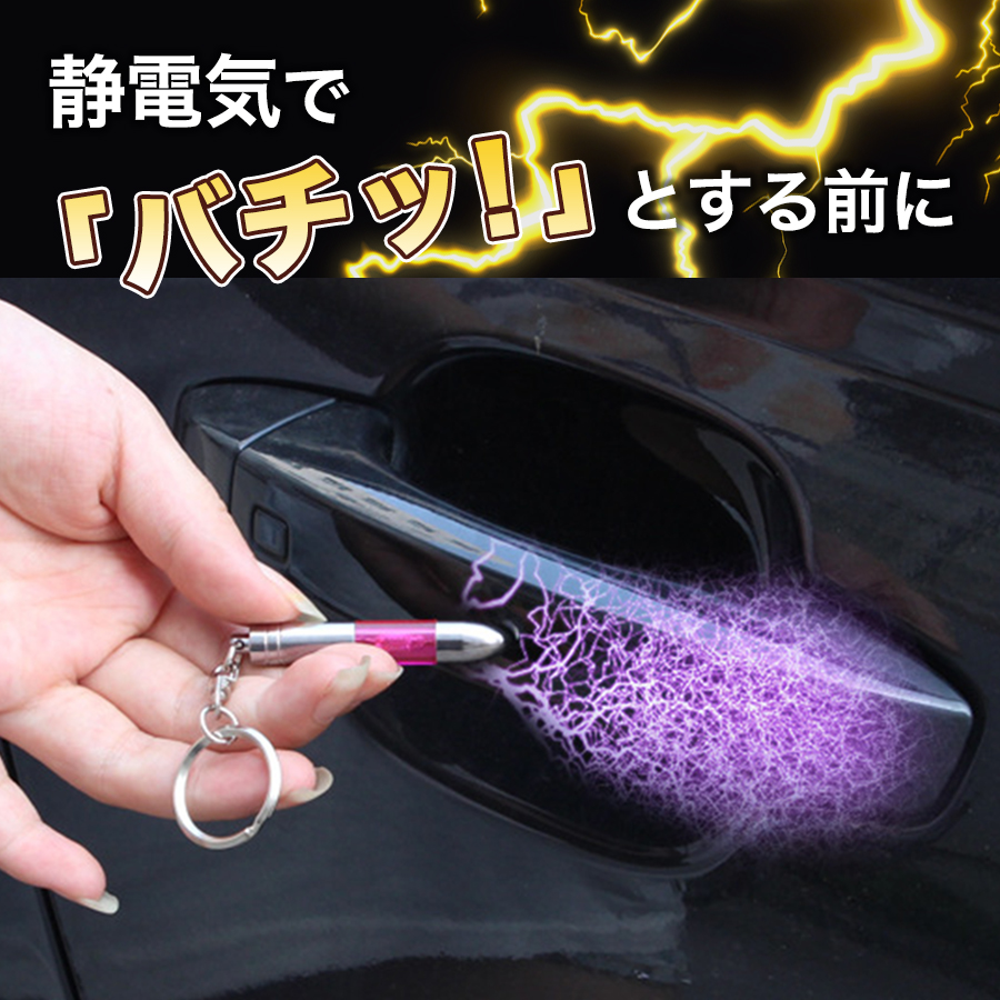 先端を車のドアなど金属部分に近づけると光りをし、嫌な静電気を除去します。