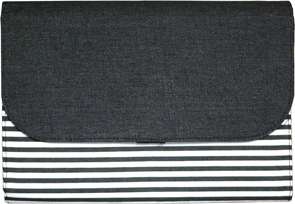 | 商品名 | 母子手帳ケース ジャバラ式 大きめ 大容量 ブラックデニム ボーダー柄 マルチケース ファスナーポケット 化粧箱入り デニムxボーダー |